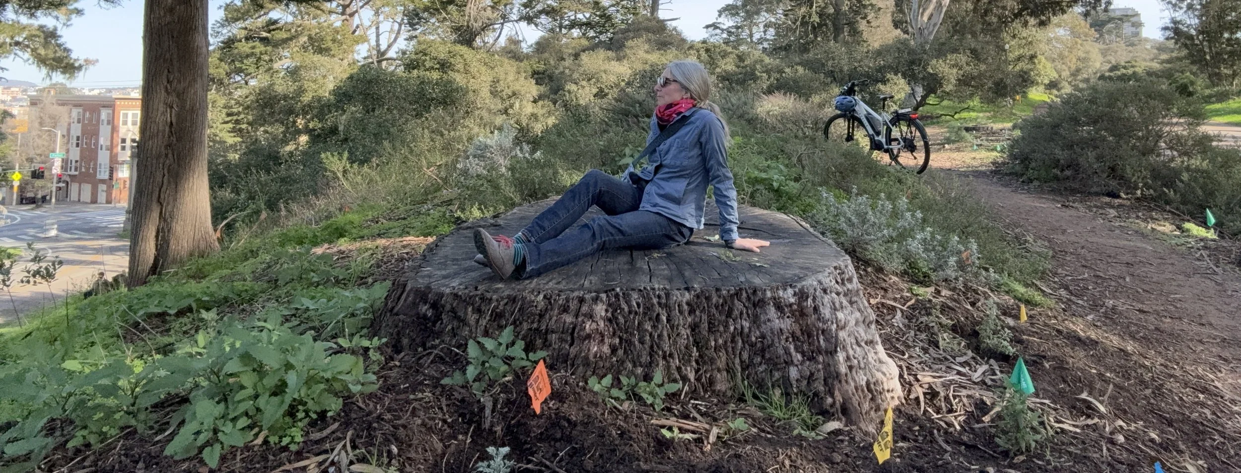 I looked around and realized that they had discovered something I’d never noticed: this two-person-sized stump likely has the best views of any stump in the park. Look to the south and there’s Sutro Tower; look to the north and you see the towers of the Golden Gate Bridge rise above the trees of the Presidio. It’s also a lovely place to watch the world go by – quietly. Sit awhile and dozens of cyclists, walkers, joggers, and people pushing strollers will pass.
